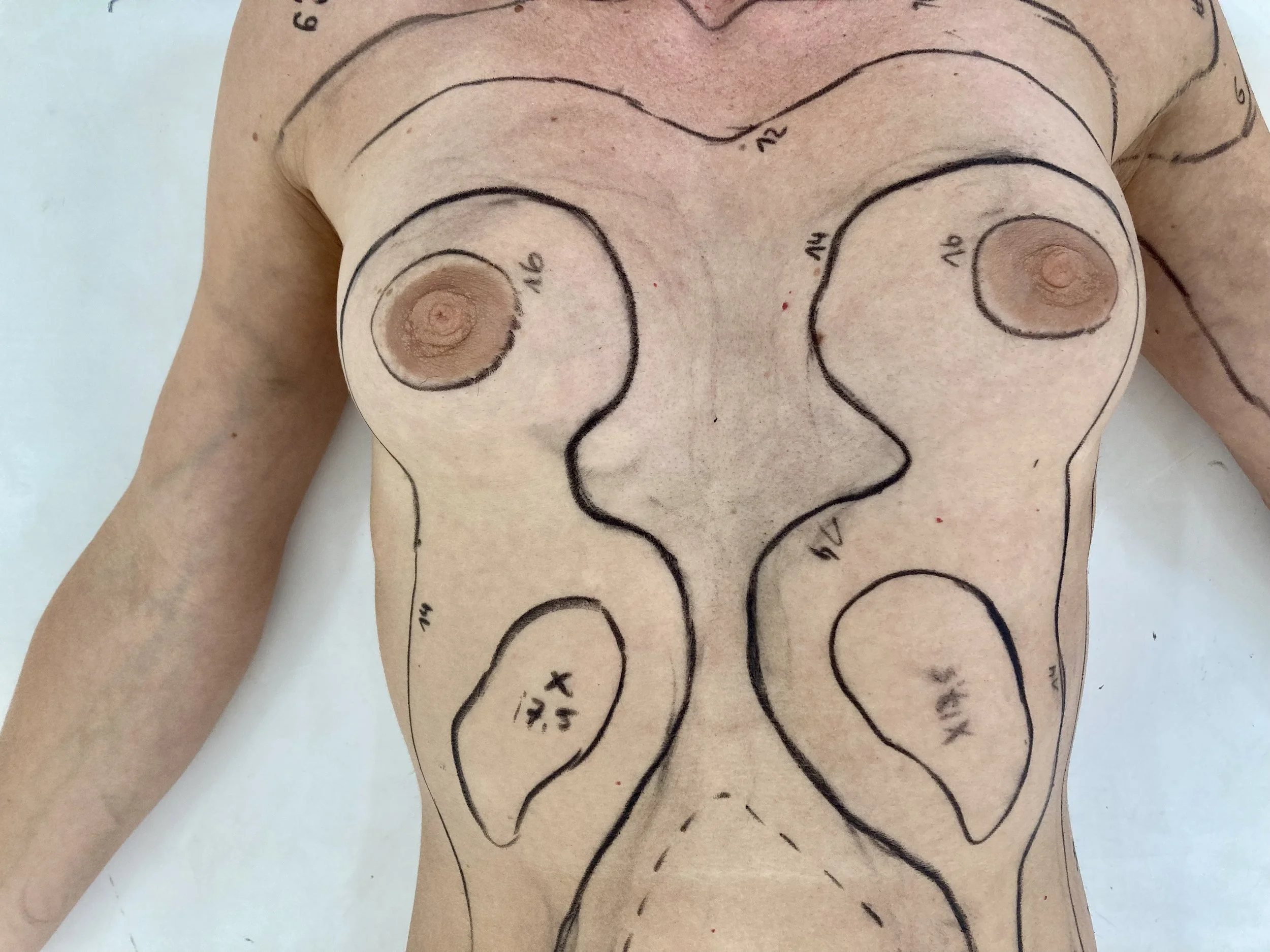 One person takes their clothes off and place on the floor the body part they want to map. The other person uses a make-up pen to draw horizontal lines on the body parts, each line needs to have an equal distance between them. (for example if the first line is one centimeter above the floor, the second line will be 1 cm above the first line and so on).